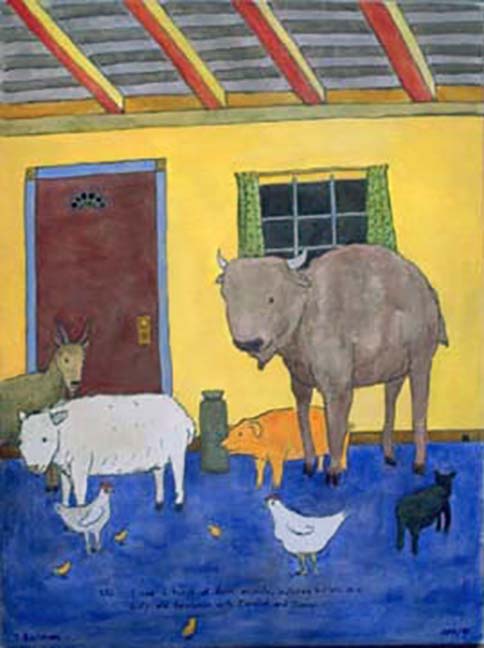 1/12 I see a bunch of farm animals, including a buffalo, in a dusty old farmhouse with Caroline and Jenny.