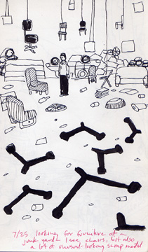 7/25/95: looking for furniture at a junk yard. I see chairs, but also a lot of unusual looking scrap metal.