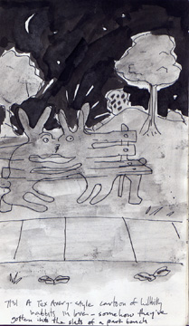 7/31/95: A Tex Avery-style cartoon of hillbilly rabbits in love -- somehow they've gotten into the slats of a park bench.