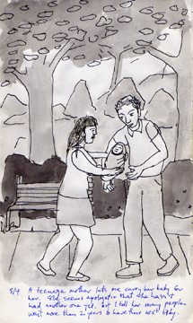 8/4/95: A teenage mother lets me carry her baby for her. She seems apologetic that she hasn't had another one yet, but I tell her many people wait more than 2 years to have their next baby.