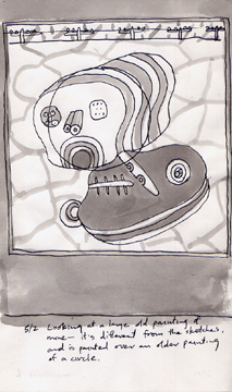 5/2/96: Looking at a large, old painting of mine. It's different from the sketches and is painted over an older painting of a circle.