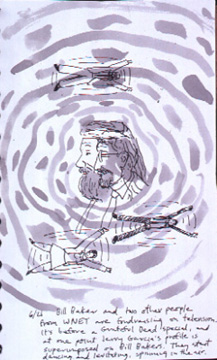 6/21/96: Bill Baker and two other people from WNET are fundraising on television. It's before a Grateful Dead special, and at one point Jerry Garcia's profile is superimposed on Bill Baker's. They start dancing and levitating, spinning in the air.